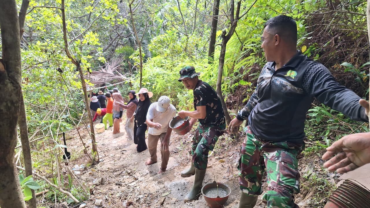Dengan membentuk barisan berantai, material dipindahkan secara manual menuju titik pengecoran. Cara ini dipilih untuk mempercepat distribusi bahan di medan yang cukup menanjak dan dipenuhi pepohonan.