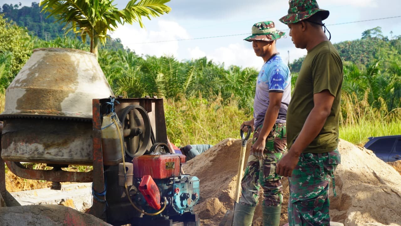 Deru mesin molen seakan membakar semangat anggota Satgas dan warga. Di bawah terik matahari, mereka bergantian mengisi tabung molen dengan material, menunjukkan kolaborasi yang solid antara TNI dan masyarakat demi kemajuan desa.