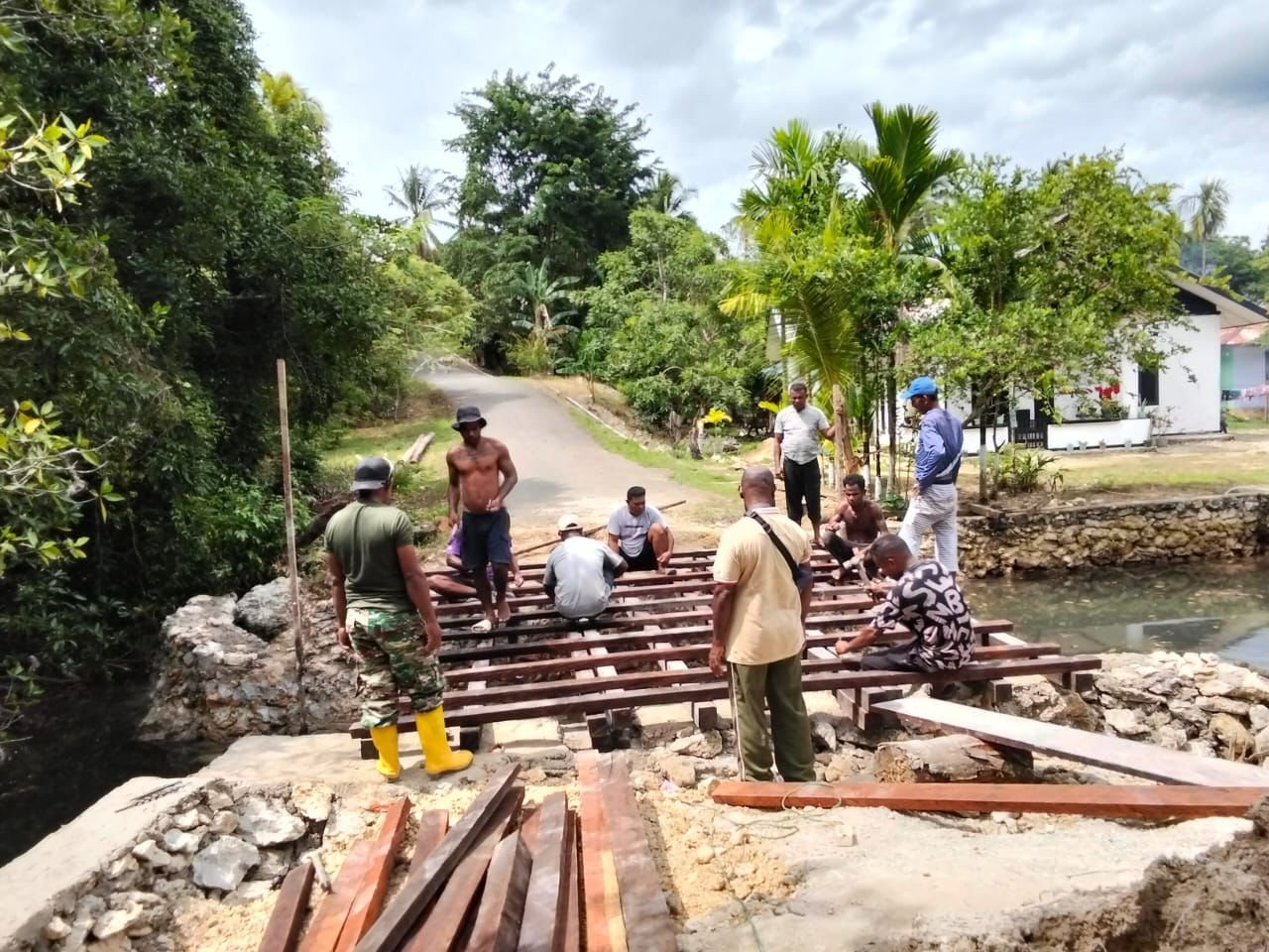 Kegiatan ini dipimpin oleh Kapten Inf Leonard Sahulata selaku Wadan Satgas TMMD 127. Di bawah arahannya, 10 personel TNI AD, 2 TNI AL, 2 anggota Komcad, serta 5 warga setempat bekerja secara gotong royong menyusun struktur rangka jembatan.