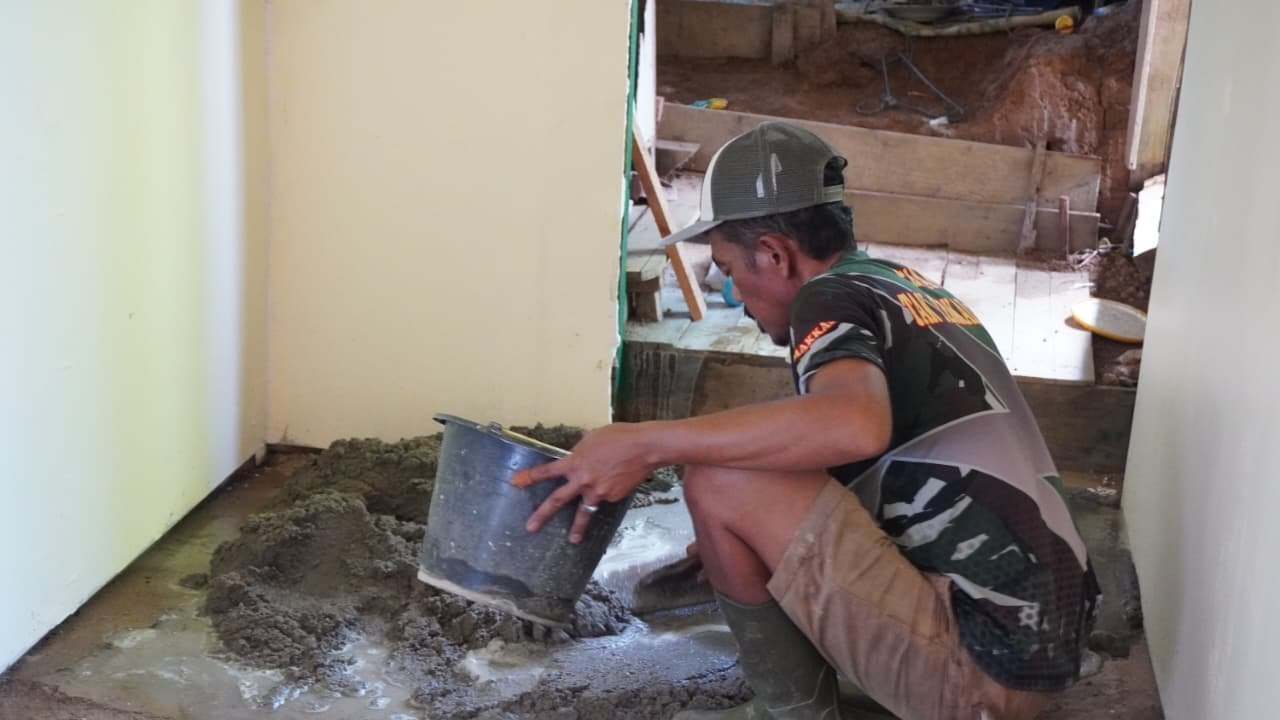 Finishing RTLH Bapak Sumardi, Satgas TMMD Ke-127 Ratakan Plester Lantai