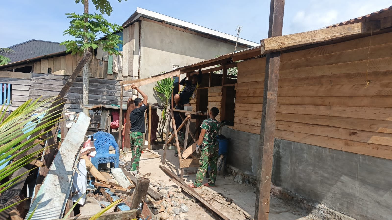 Personel Satgas bersama warga setempat bahu-membahu menyelesaikan pembangunan dapur yang menjadi salah satu sasaran fisik program tersebut.