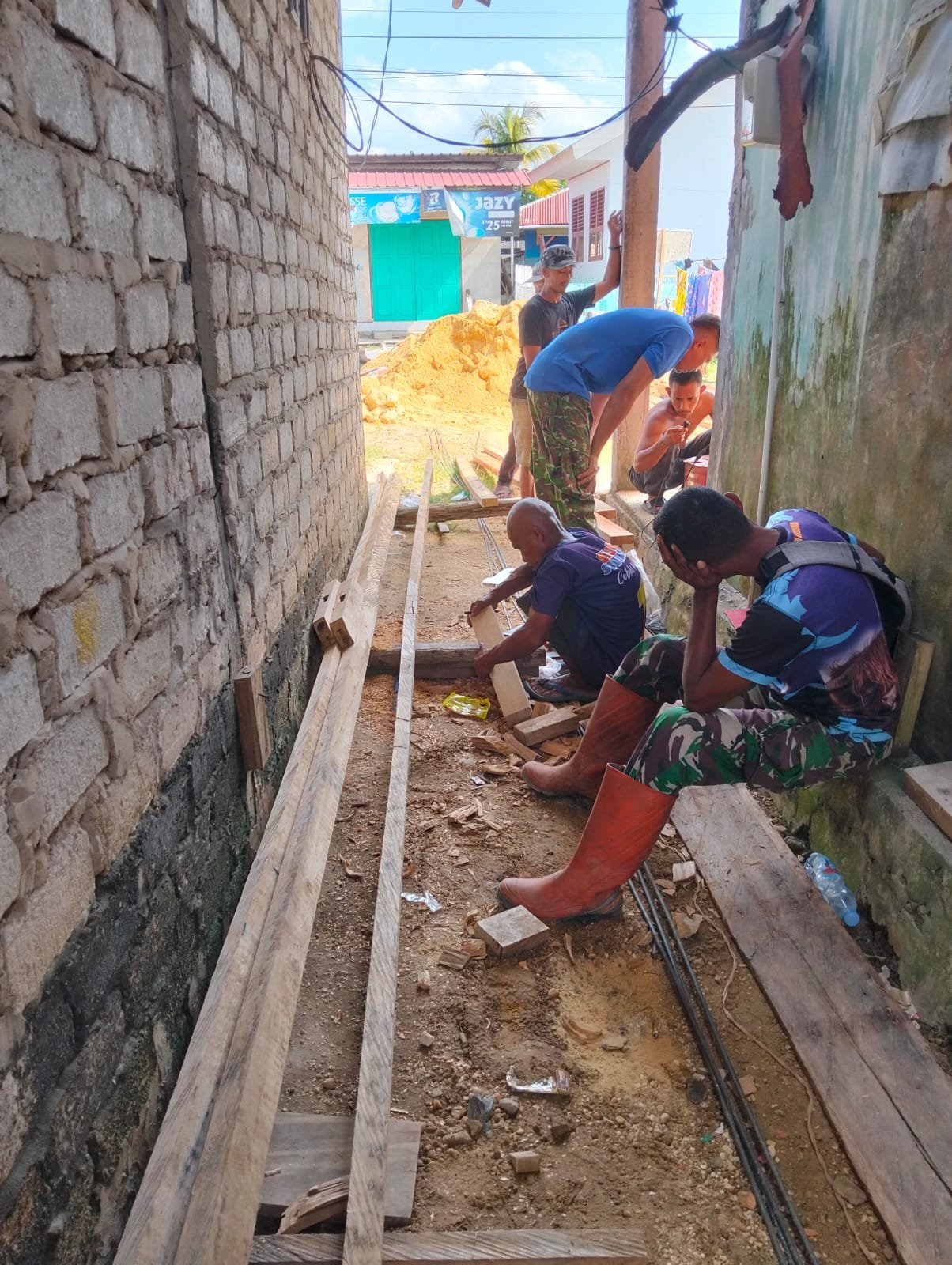 Dalam proses pembangunan Rumah Tidak Layak Huni (RTLH), personel Satgas bersama warga terlihat saling bekerja sama memahat dan menyesuaikan balok-balok kayu agar sambungan konstruksi dapat terpasang dengan sempurna.