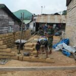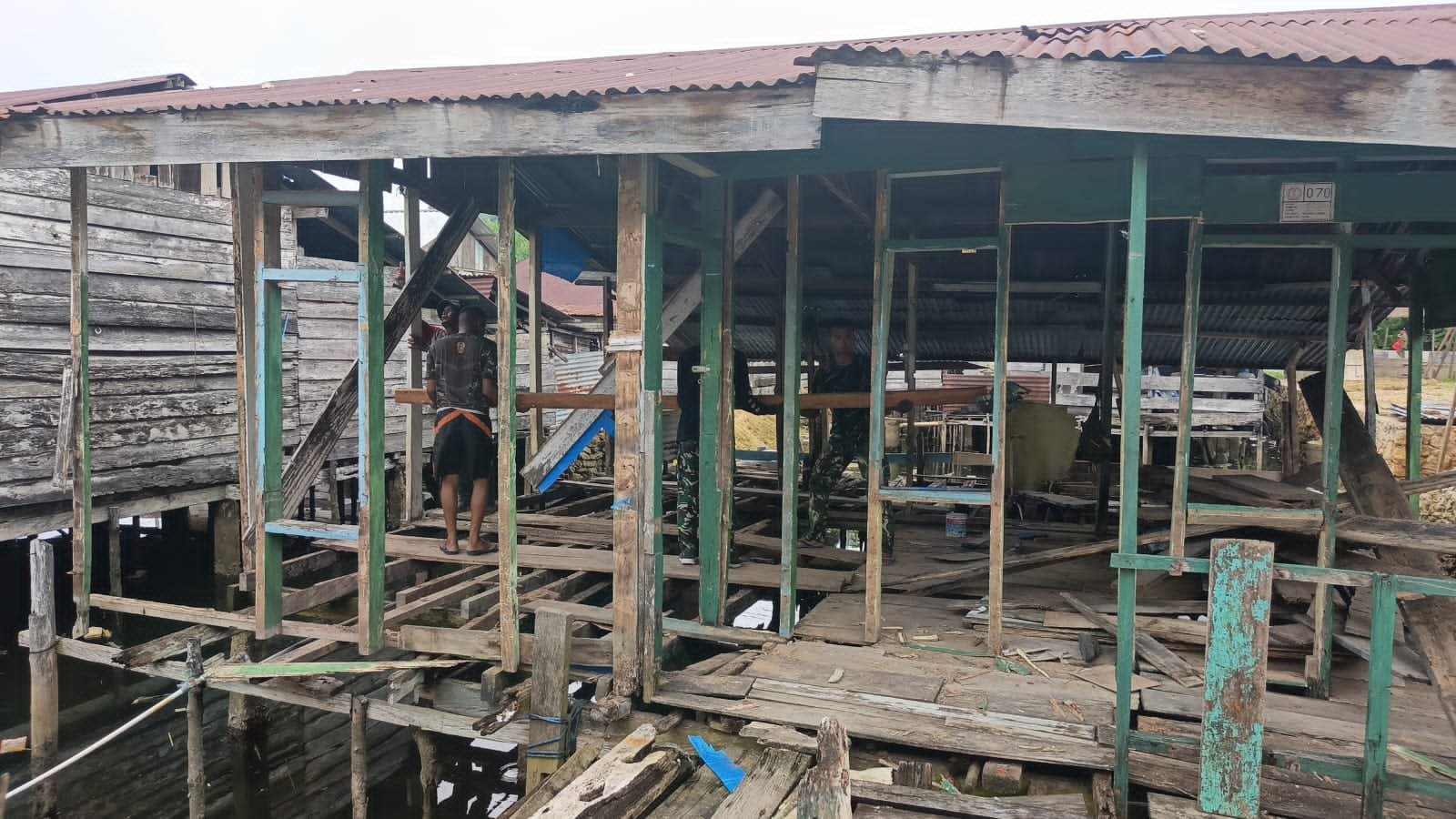 Personel Satgas bersama masyarakat setempat bekerja sama membongkar bagian bangunan lama, lalu membangun kembali dengan material yang lebih kuat dan tahan lama.