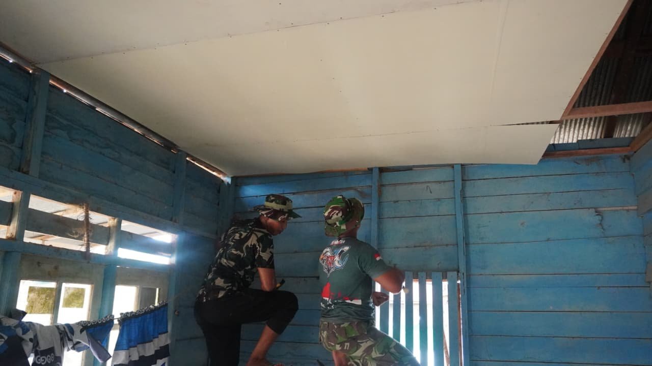 Anggota Satgas terlihat bekerja sama memotong, mengecat, dan memasang triplek plafon dengan cermat. Pengecatan warna putih dilakukan terlebih dahulu agar hasil akhir tampak lebih rapi.