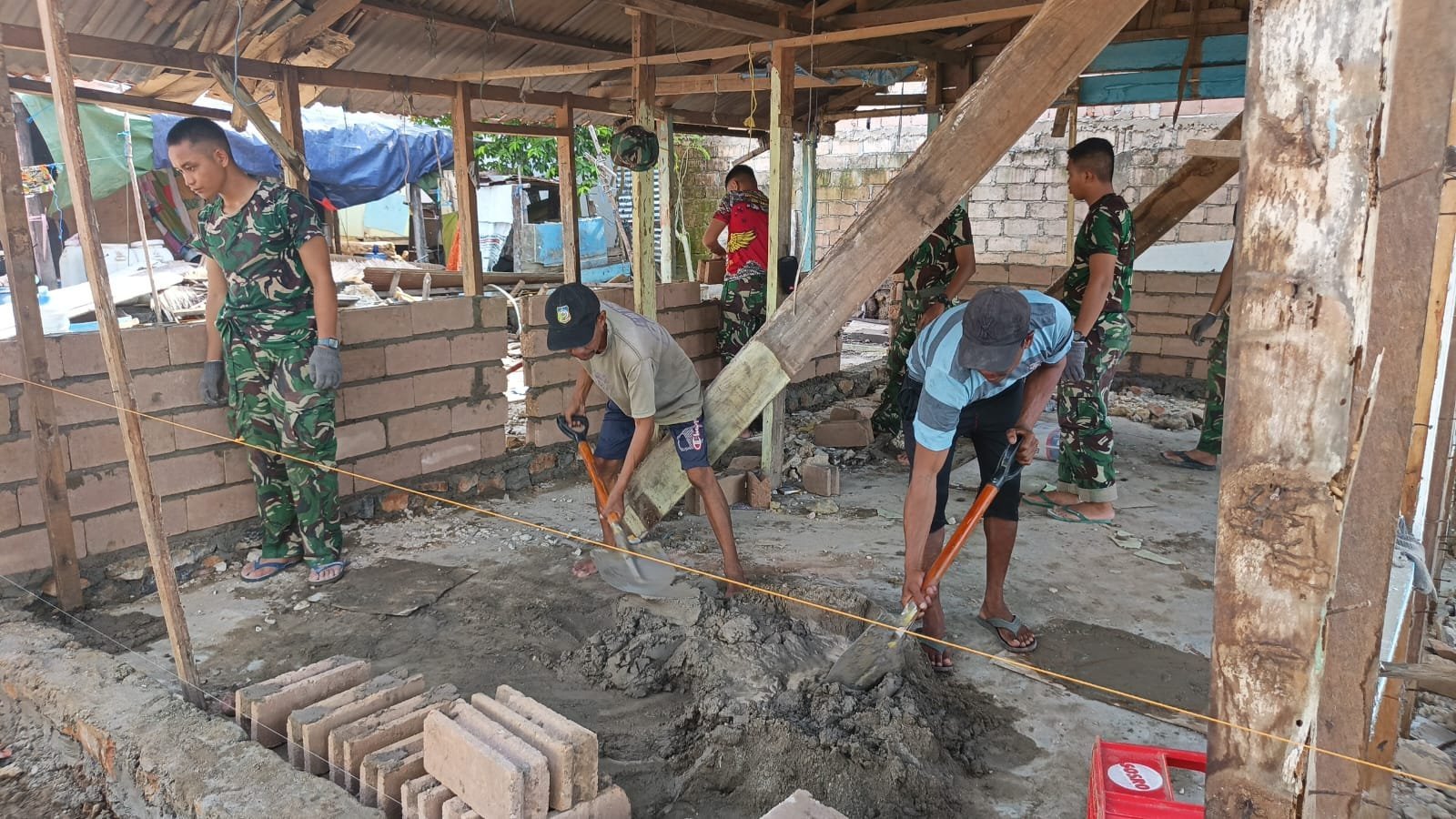 Personel TNI dan masyarakat bahu-membahu mendirikan dinding rumah pada titik sasaran ke-3. Penyusunan material dilakukan secara terukur demi menghasilkan bangunan yang kuat dan tahan lama.