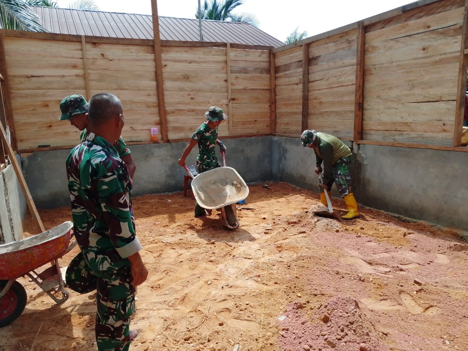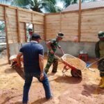 Personel Satgas bersama warga setempat tampak kompak melakukan penimbunan material sebagai bagian dari proses pembangunan lantai rabat beton yang menjadi salah satu sasaran fisik utama program TMMD.