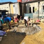 Personel Satgas bersama masyarakat setempat tampak bahu-membahu melakukan pengecoran slop beton yang menjadi salah satu tahapan penting dalam pembangunan rumah layak huni bagi warga kurang mampu.
