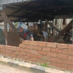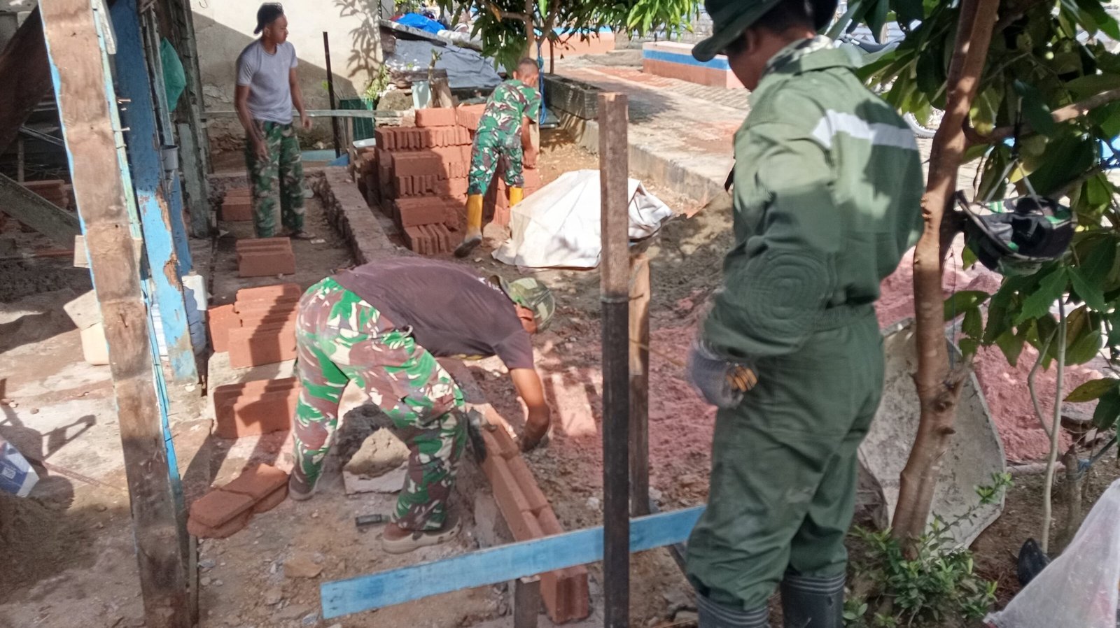 Pada tahap pemasangan batu bata, personel TNI bersama warga saling bahu-membahu menyusun material bangunan dengan penuh semangat. Suasana kerja yang kompak mencerminkan kuatnya kemanunggalan TNI dan rakyat dalam membangun lingkungan yang lebih baik.