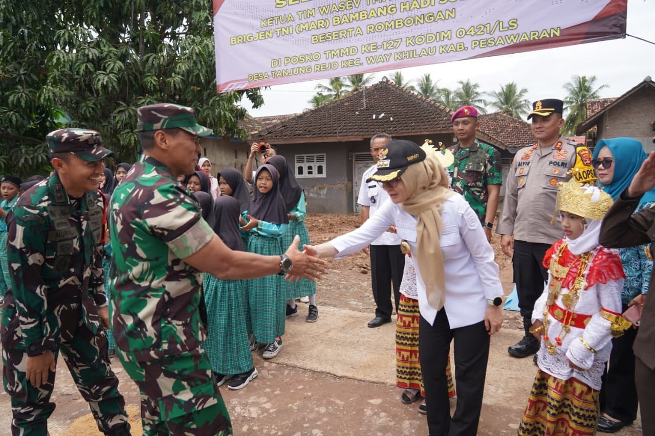PESAWARAN – Kedatangan Waaster Panglima TNI, Bambang Hadi Suseno di Desa Tanjung Rejo, Kecamatan Way Khilau, Kabupaten Pesawaran, disambut meriah oleh masyarakat setempat. Kehadiran Waaster Panglima TNI tersebut dalam rangka melaksanakan kegiatan Pengawasan dan Evaluasi (Wasev) program TNI Manunggal Membangun Desa (TMMD) ke-127 yang digelar oleh Kodim 0421/Lampung Selatan.