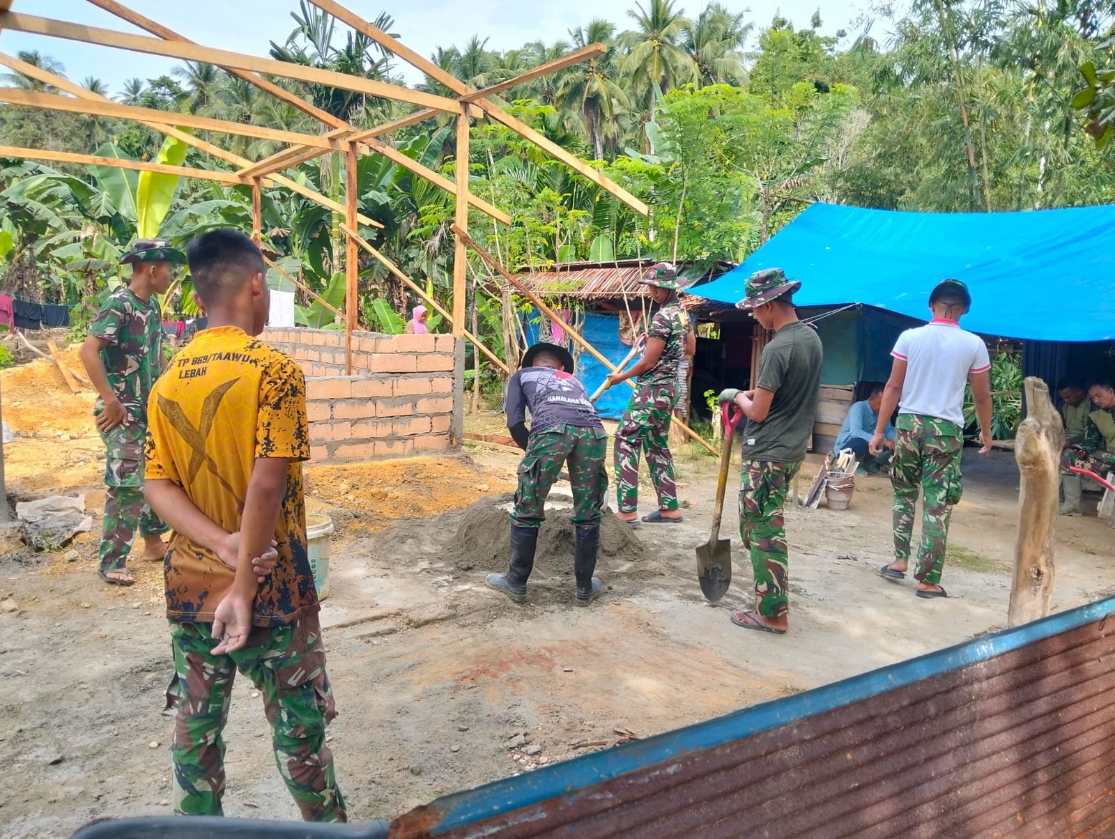 Dalam kegiatan pembangunan Rumah Tidak Layak Huni (RTLH), personel Satgas TMMD bersama warga setempat bekerja secara gotong royong menyelesaikan berbagai tahapan konstruksi, mulai dari penyusunan bata hingga pemasangan rangka atap rumah.