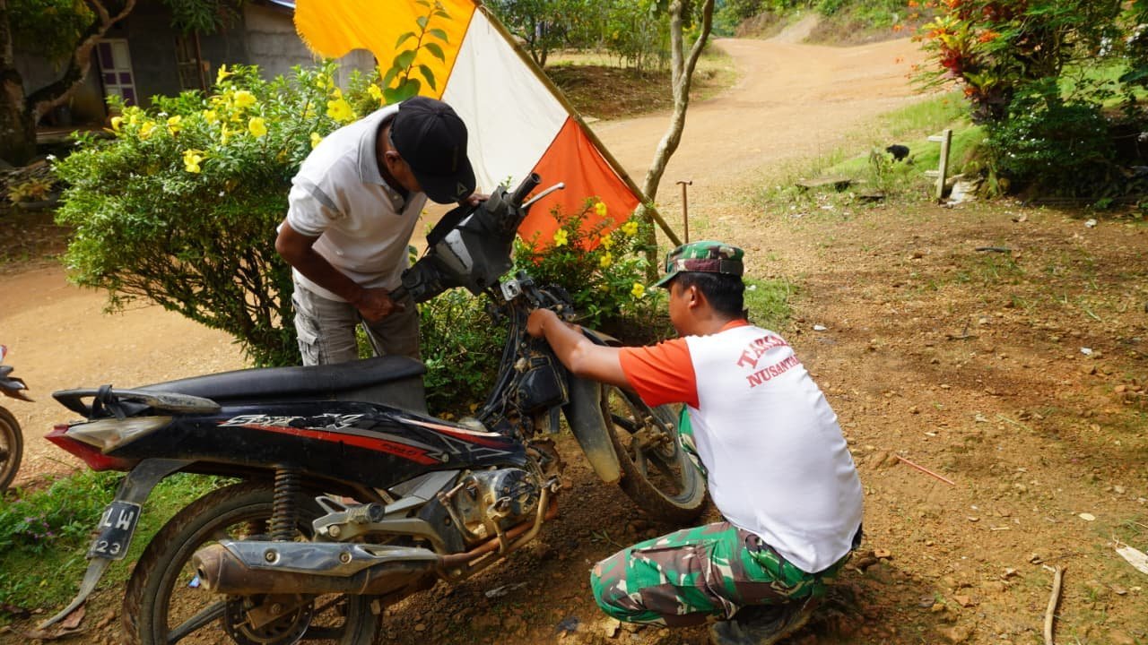 Di sela-sela kegiatan pembangunan siring badan jalan, sumur bor dan MCK, Koptu Iwan yang memiliki keahlian di bidang otomotif dengan sigap memperbaiki sepeda motor milik Mahmud yang mengalami kerusakan.