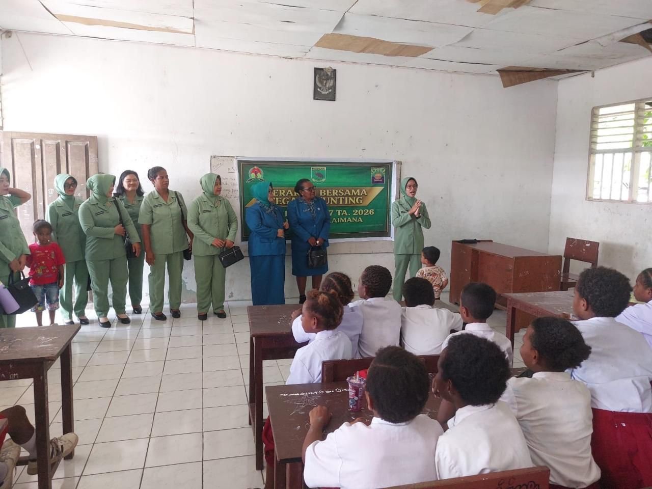 Kaimana – Dalam rangka mendukung kegiatan nonfisik program TMMD ke-127, Ketua Persit Kartika Chandra Kirana (KCK) Cabang XL Kodim Kaimana bersama pengurus Persit melaksanakan kegiatan Gerakan Bersama Mencegah Stunting yang digelar di Kampung Marsi, Distrik Kaimana, Kabupaten Kaimana.