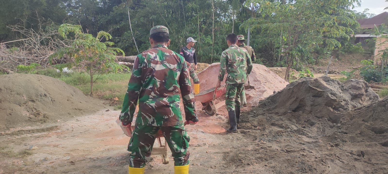 Aksi angkut material secara manual juga mencerminkan kekompakan dan kemanunggalan antara TNI dan warga dalam menyukseskan program pembangunan.