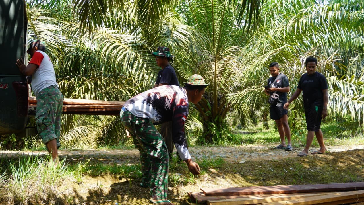 Anggota Satgas TMMD bersama masyarakat tampak kompak menurunkan material kayu yang diangkut menggunakan kendaraan dinas TNI. Semangat gotong royong terlihat jelas saat proses pembongkaran dilakukan secara bersama-sama di lokasi pembangunan.
