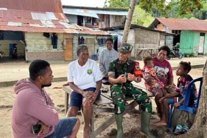 Kaimana – Komandan Satuan Tugas TNI Manunggal Membangun Desa (TMMD) ke-127 Kodim 1804/Kaimana, Letkol Kav Sulistyo Nugroho, meluangkan waktu untuk bercengkrama dengan masyarakat Kampung Namatota, Dist...