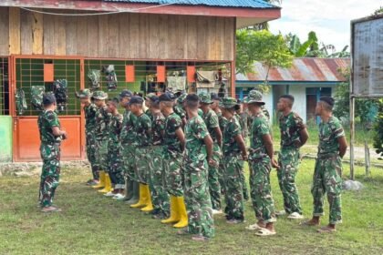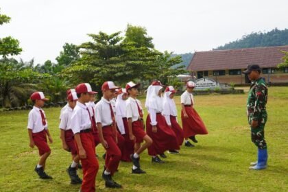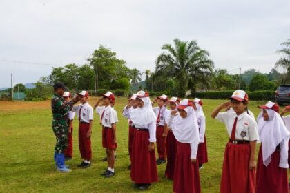 Kotawaringin Timur – Satuan Tugas TMMD Reguler ke-127 Kodim 1015/Sampit memberikan pelatihan Peraturan Baris Berbaris (PBB) kepada murid Sekolah Dasar di Desa Tri Buana, Kecamatan Telaga Antang, Kabup...