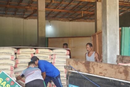 Kotawaringin Timur – Anggota Satgas TMMD Reguler ke-127 Kodim 1015/Sampit bersama masyarakat melaksanakan kegiatan langsir material semen menggunakan kendaraan pickup di Desa Tri Buana, Kecamatan Tela...
