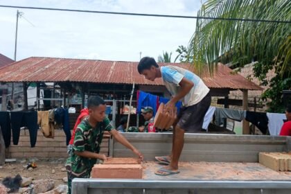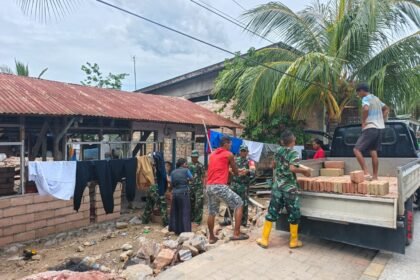 Kendari – Personel Satgas TMMD ke-127 bersama masyarakat Kota Kendari menunjukkan kekompakan saat melangsir material bangunan untuk program Rumah Tidak Layak Huni (RTLH), Senin (23/2). Material sepert...