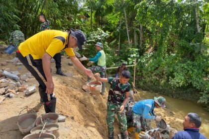 Kendari – Personel Satgas TMMD ke-127 Kodim 1417/Kendari terus memacu tahapan pembangunan jembatan di Kelurahan Sambuli, Minggu (22/2). Pada tahap kali ini, prajurit TNI bersama masyarakat setempat fo...