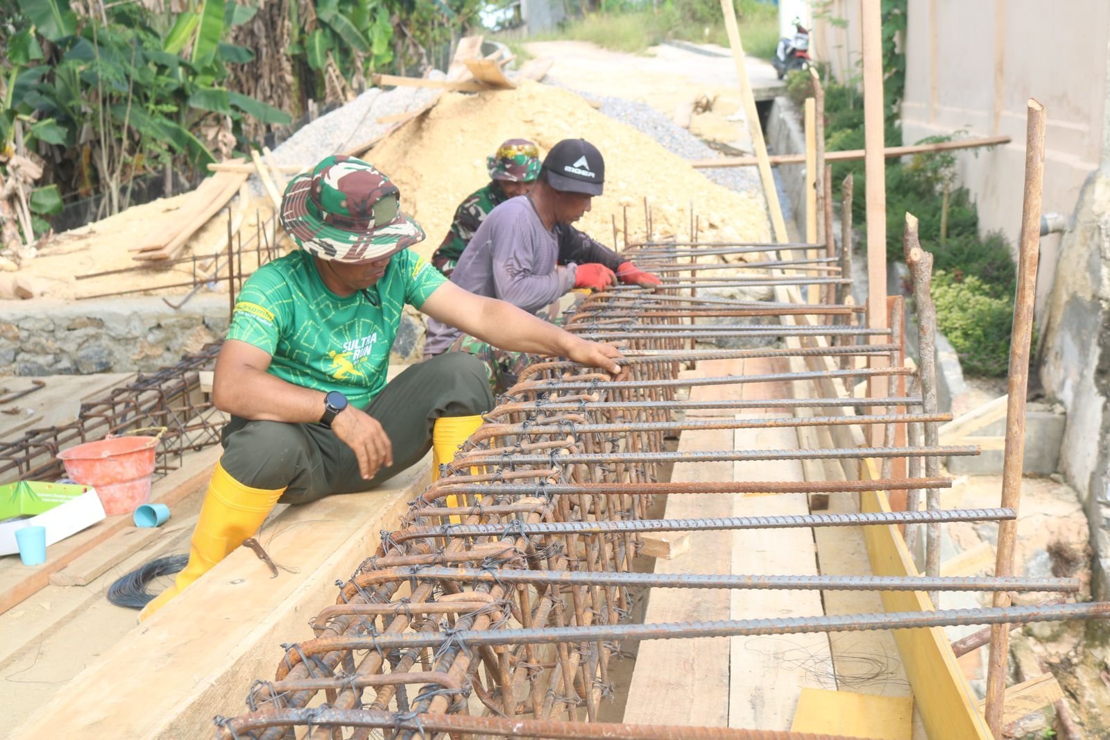 Personel Satgas bersama masyarakat setempat bahu-membahu merakit besi tulangan yang akan menjadi kerangka utama badan jembatan. Kolaborasi ini menjadi bukti kuat kemanunggalan TNI dan rakyat dalam mendorong pemerataan pembangunan.