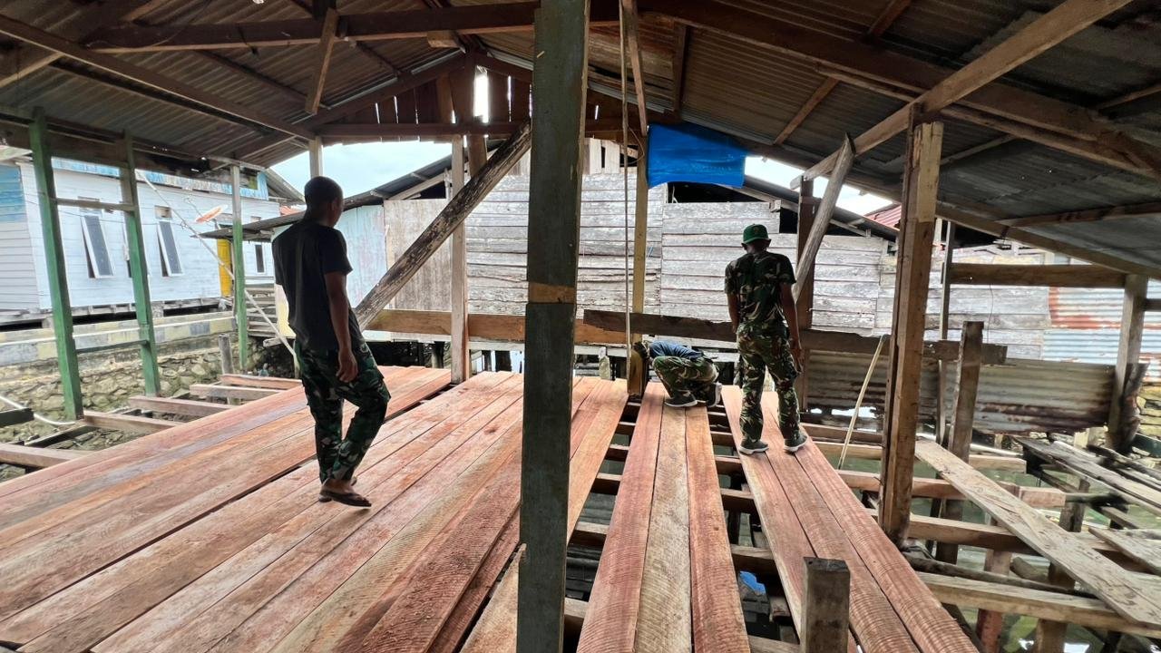 Personel Satgas terlihat fokus mengerjakan pemasangan lantai kayu sebagai bagian dari penyempurnaan struktur rumah di Kelurahan Petoaha, Kecamatan Nambo.