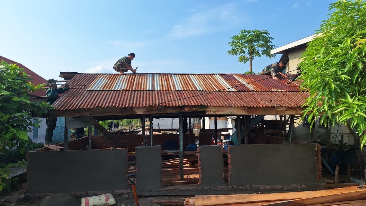 Diawali dengan pembongkaran atap seng yang telah usang, personel Satgas bersama warga setempat bekerja gotong royong memastikan setiap bagian rumah yang rusak segera diperbaiki.