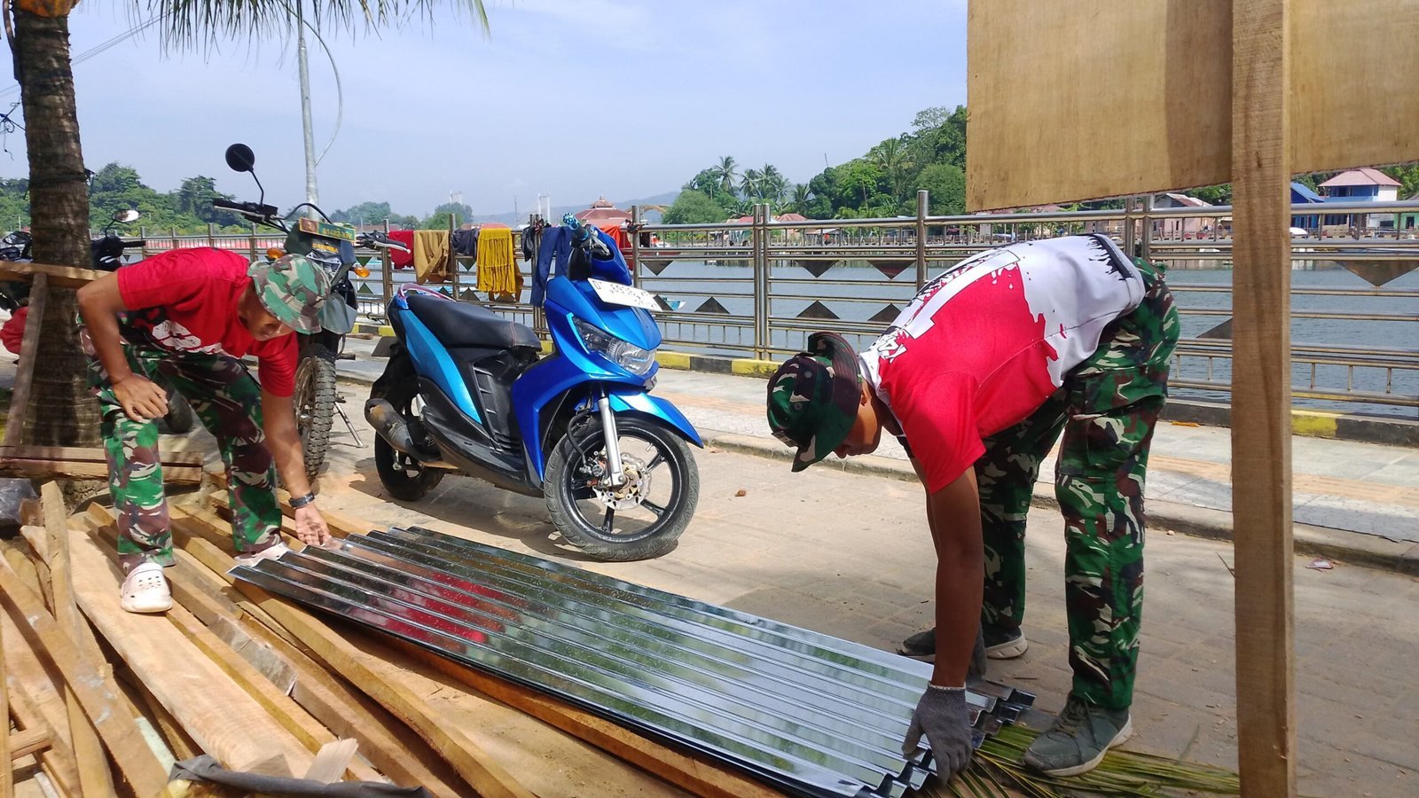 Dalam tahap terbaru pembangunan, personel Satgas TMMD bersama masyarakat melakukan pemasangan material atap baru sebagai bagian dari proses penyelesaian renovasi rumah.