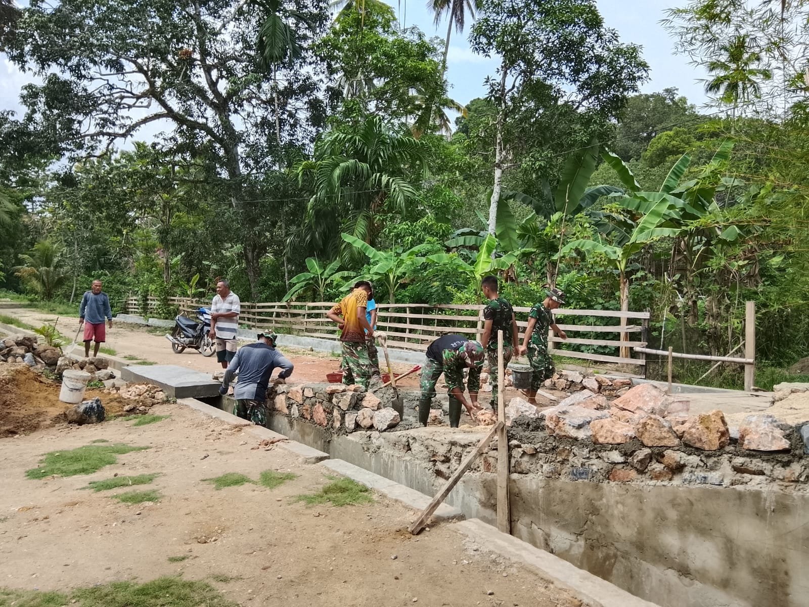 Anggota dari Kodim 1417/Kendari bersama warga setempat tampak kompak menyusun batu gunung sebagai dasar utama struktur jembatan.
