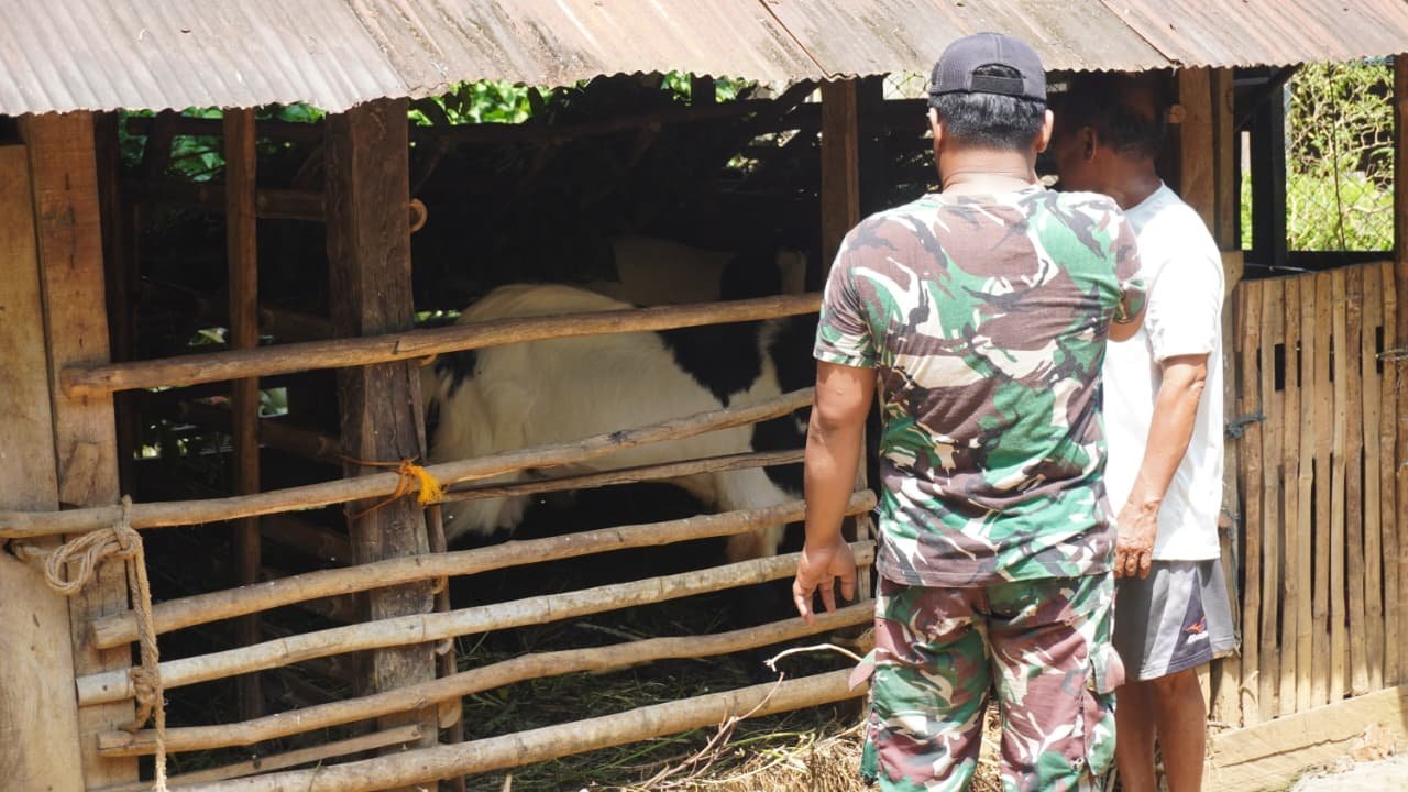 Salah satu anggota satgas, Pratu Ramli, memanfaatkan waktu senggangnya untuk mengunjungi kediaman Bapak Sutarman (55), warga yang menekuni usaha peternakan kambing di Desa Tri Buana. Kunjungan ini menjadi momen silaturahmi yang hangat dan penuh keakraban.