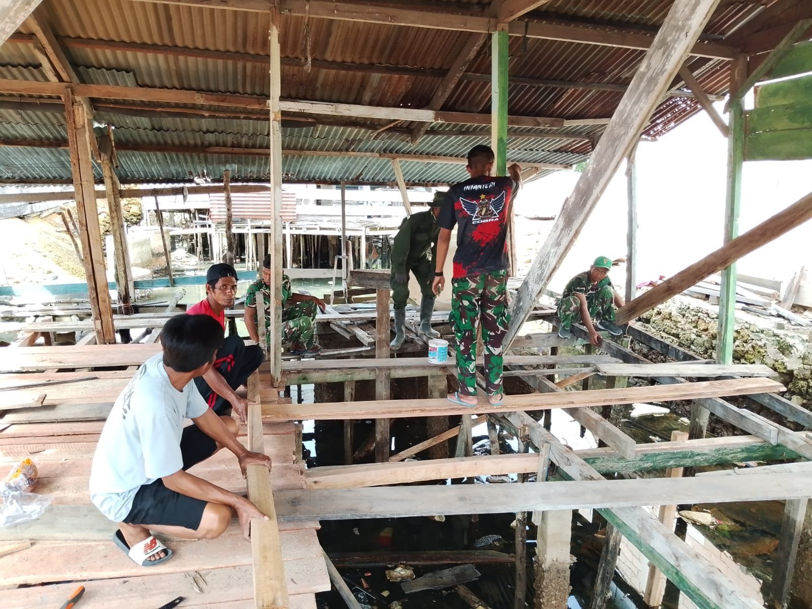 Personel Satgas bersama masyarakat setempat tampak bahu-membahu menyelesaikan setiap proses pekerjaan, mulai dari perbaikan struktur bangunan hingga tahap finishing.