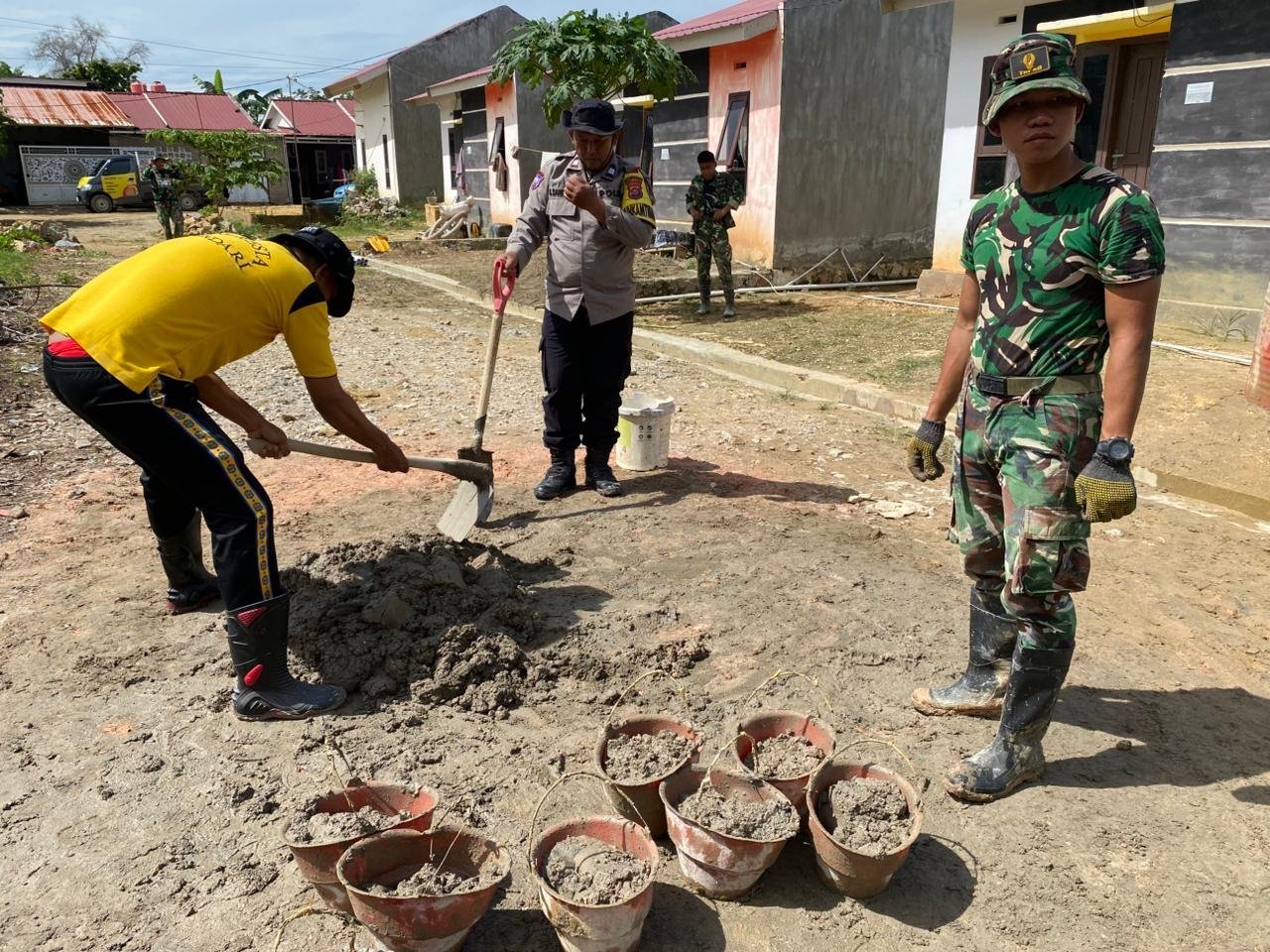 Personel TNI bersama aparat Kepolisian setempat tampak bekerja ekstra keras memindahkan material bangunan di medan yang cukup menantang. Kondisi lokasi yang berbukit tidak menyurutkan semangat mereka untuk menuntaskan pekerjaan sesuai target.