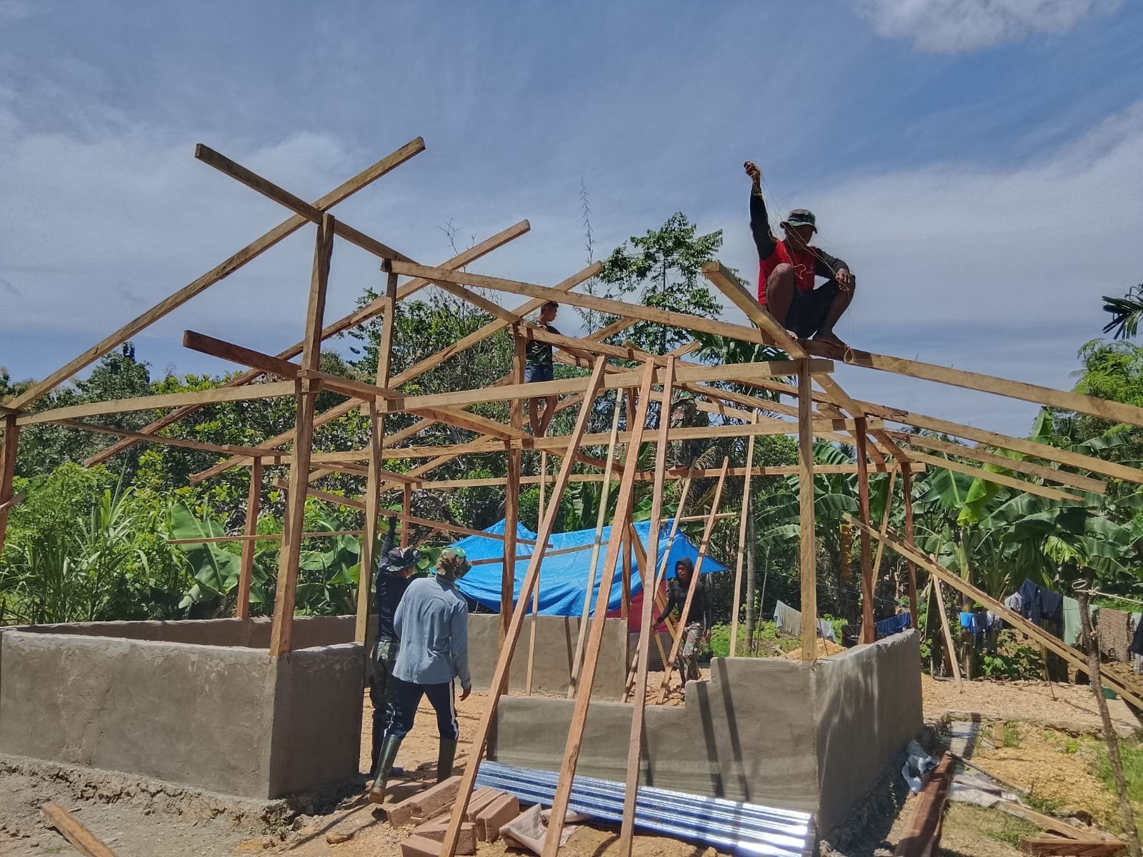 Pantauan di lokasi menunjukkan bahwa kerangka atap rumah telah terpasang dengan rapi, sementara dinding bangunan juga sudah berdiri tegak sebagai bagian dari tahapan pembangunan yang terus dikebut oleh personel Satgas TMMD.