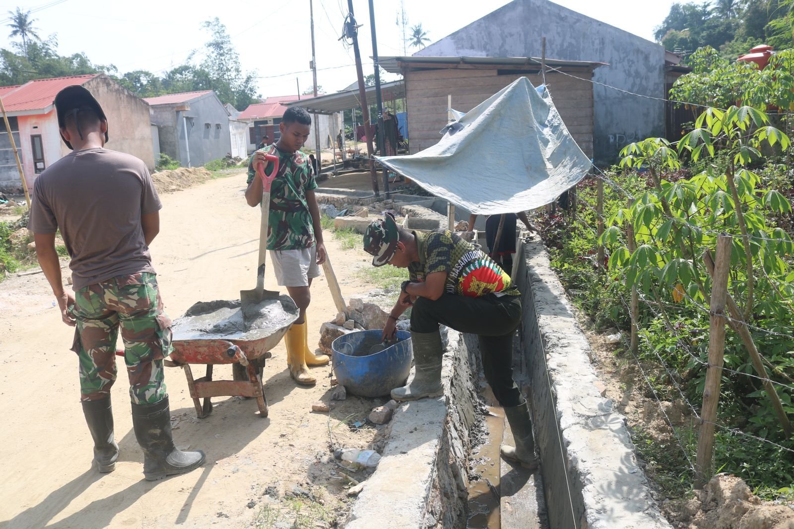 Para prajurit bersama warga setempat bekerja secara gotong royong mengaplikasikan campuran semen pada dinding drainase agar permukaannya lebih rapi dan kokoh.