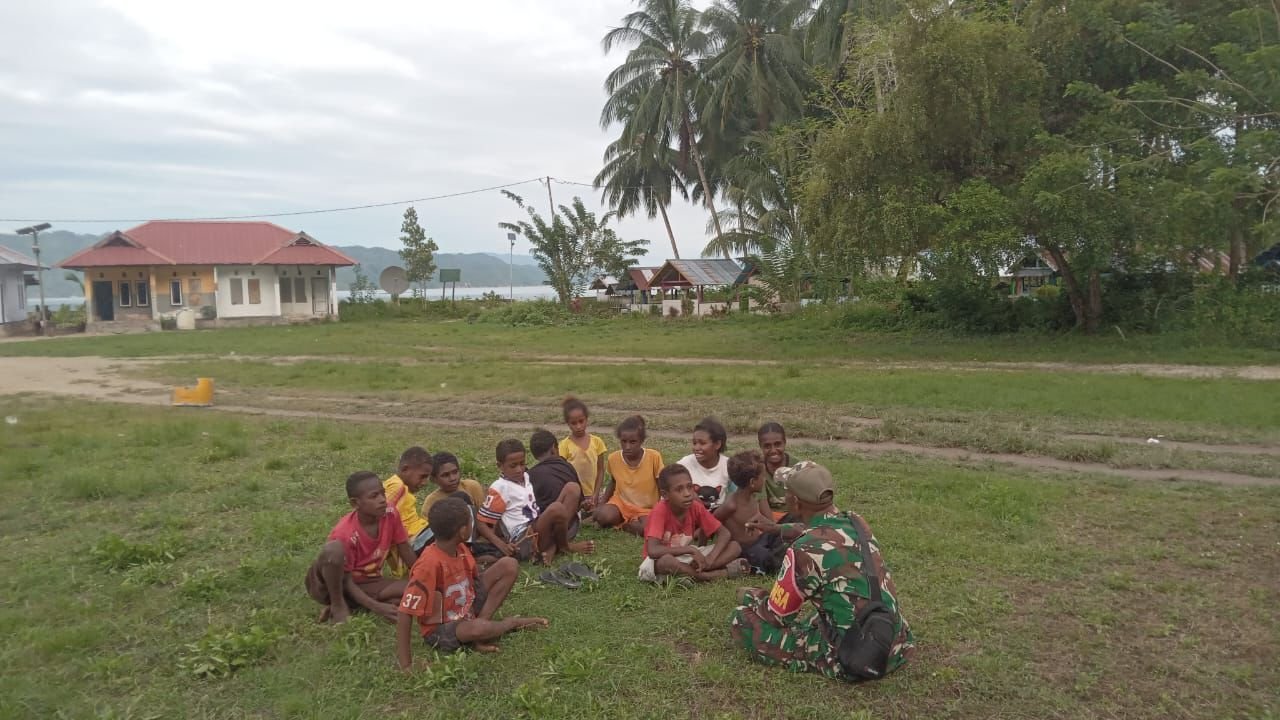 Satgas TMMD 127 Kodim 1804/Kaimana Manfaatkan Waktu Istirahat untuk Tanamkan Wawasan Kebangsaan kepada Anak-anak Kampung Marsi