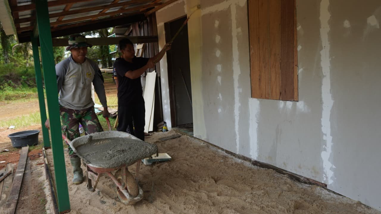 Kotawaringin Timur – Program TNI Manunggal Membangun Desa (TMMD) ke-127 terus menunjukkan progres positif di Desa Bukit Indah, Kecamatan Telaga Antang, Kabupaten Kotawaringin Timur. Salah satu sasaran fisik yang saat ini dikerjakan adalah pembangunan Rumah Tidak Layak Huni (RTLH) milik Ibu Tuminah. Jumat (06/03/2026).