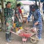 Kolaborasi lintas angkatan ini terlihat saat para prajurit bahu-membahu mengangkut material semen menggunakan gerobak dorong dan ember menuju titik pengecoran.