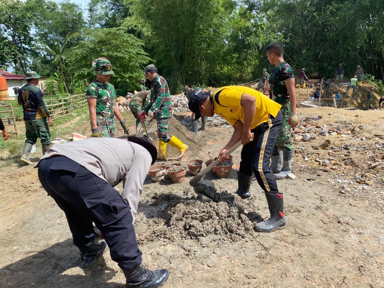Dengan mengenakan seragam kebanggaan masing-masing, para personel tampak kompak menyusun batu dan merapikan material tanah di area perbukitan. Kebersamaan ini menjadi gambaran kuatnya soliditas TNI-Polri dalam mendukung pembangunan daerah.